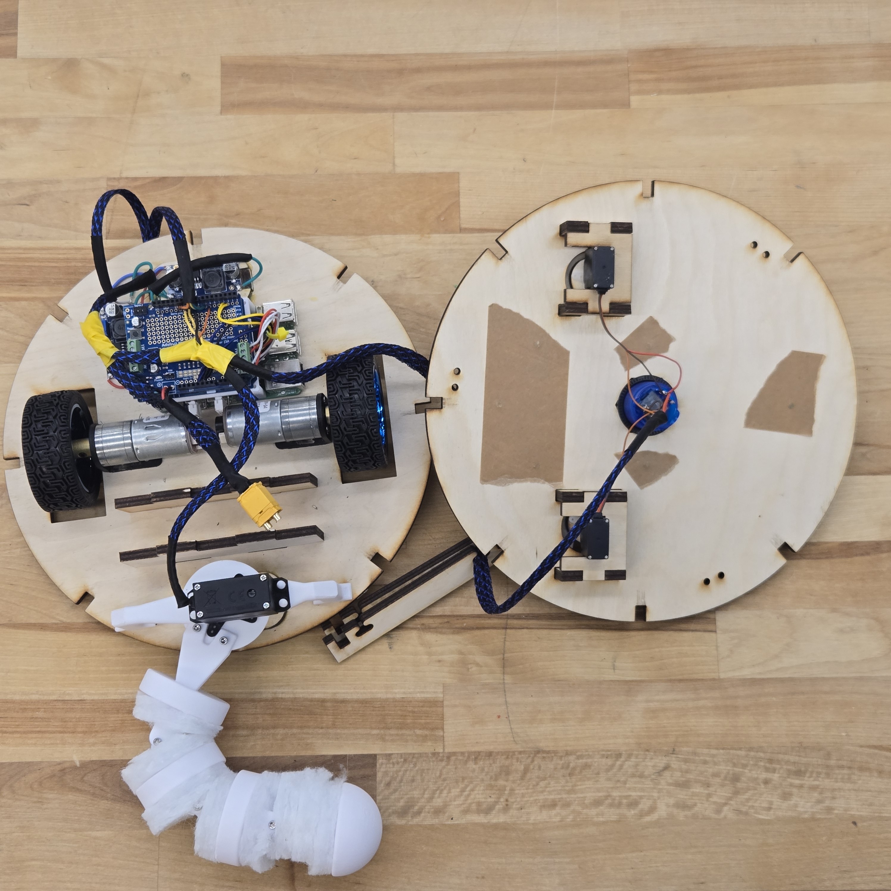 The main goals for the mechanical design of the Fox-Bot were to be easy to take apart and put back together, and to be visually fox-like and cute. To achieve the first goal we made a modular skeleton out of lasercut plywood. All joints are pressfit or secured with bolts, to ease disassembly and access to the inside electronics. Plywood was also chosen to be cost effective and sustainable. To achieve the second goal we built moving ears and tail, hid the camera in the nose, and covered the entire Fox-Bot in faux-fur. We’ve broken our design process into six main aspects which we’ll cover here.