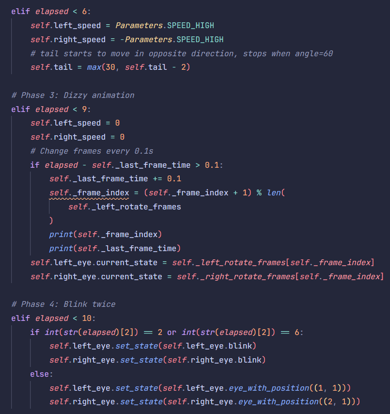 We began with some basic idle functions like sleep() and chase_tail() that sets these parameters to a certain value or state according to time and phase of the behavior. For example, in chase_tail(), its tail would first move to one side, then it spin at its tail’s direction, and finally it gets dizzy eyes.