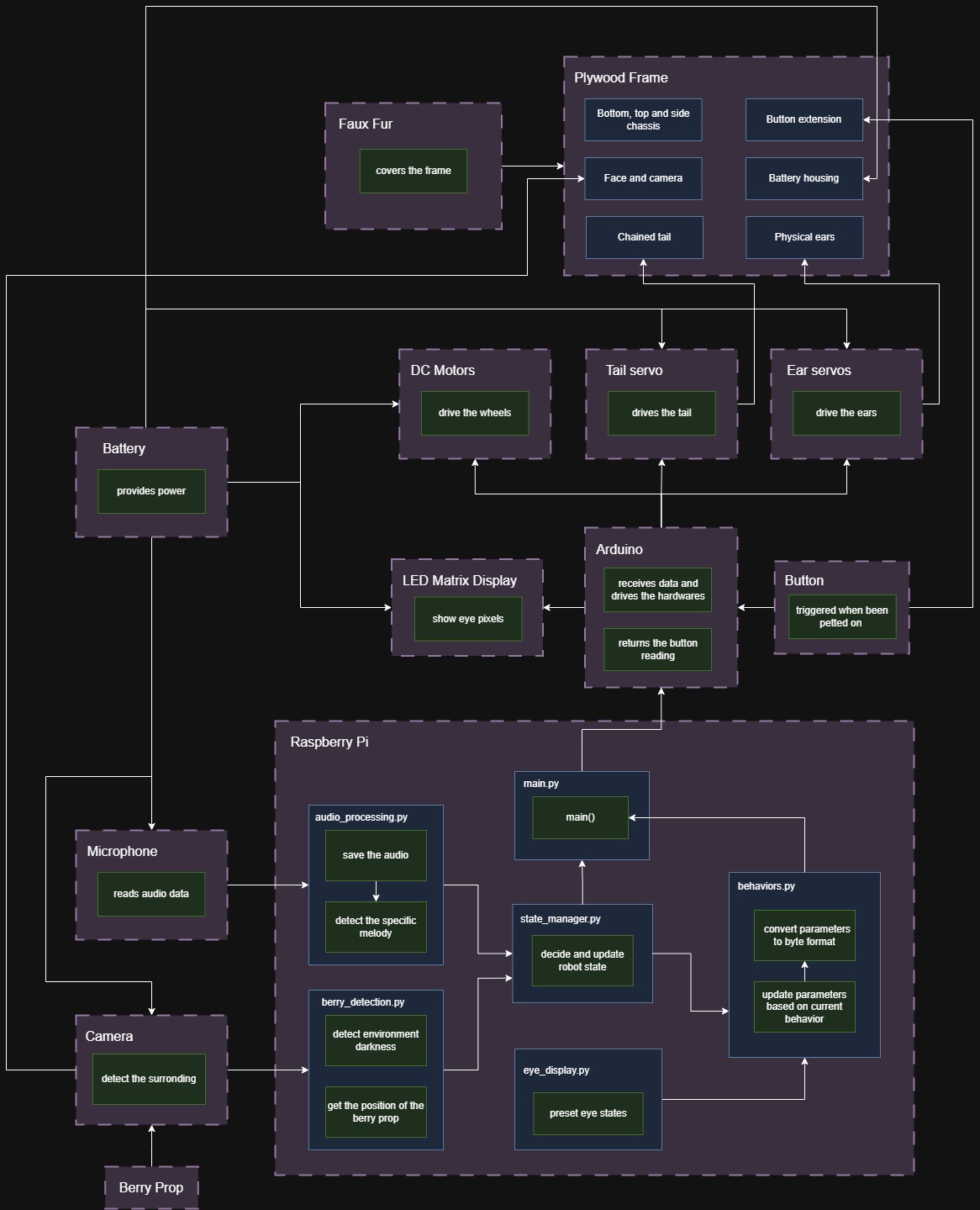 In order to make the robot feel like a real pet, we wanted to be able to interact with it in ways such as petting it or playing music, and have it respond.